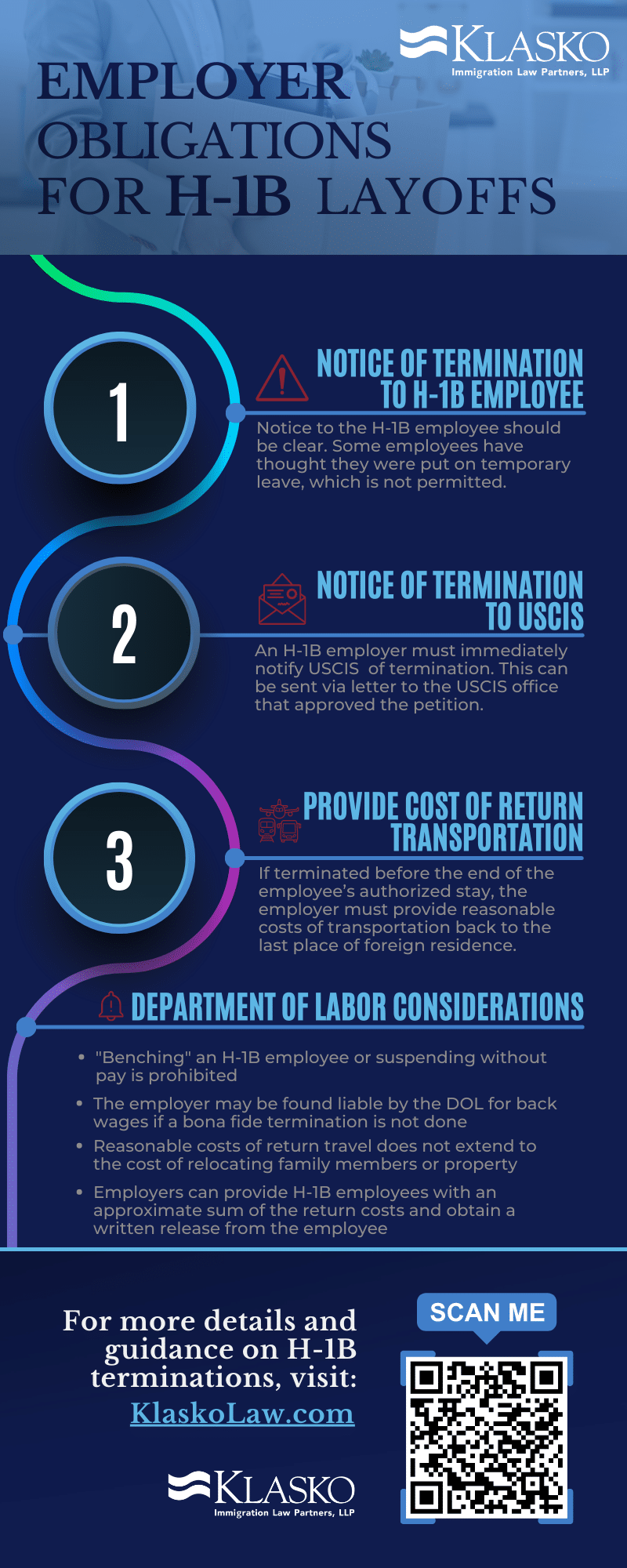 Detailed and further guidance on the termination of H-1B employees can be found here, and the below infographic has an overview of the basics of an H-1B layoff. If your company is going through layoffs and it is essential to consult with immigration counsel to avoid any missteps. Please contact one of Klasko’s experienced employment-based immigration attorneys here.